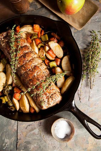 Eine Mahlzeit für die sehr hungrigen, Schweinebraten mit angebratenem Gemüse vom Hof.