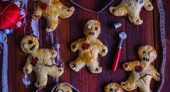 halbe Paprikaschoten, gefüllt mit Frischkäse. Mumifiziert mit Blätterteigbandagen