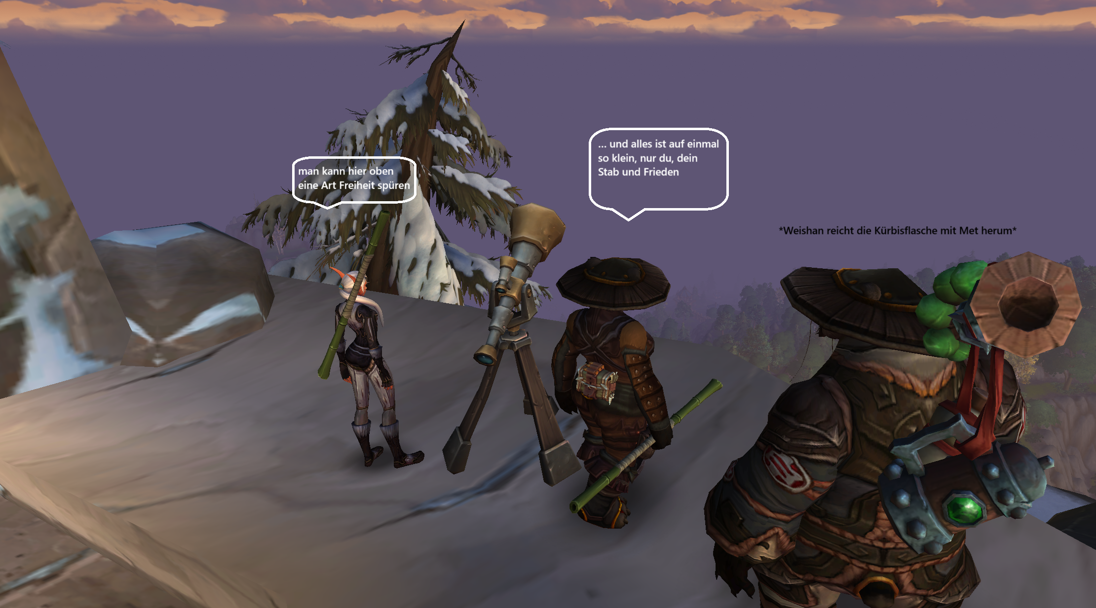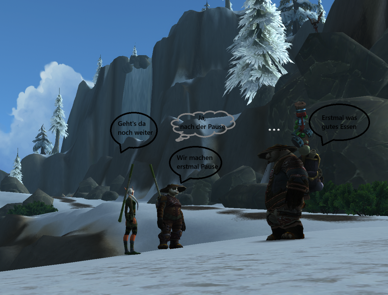 Der PandarenImbiss hatte kaum zu und der Meisterkoch zog sich trotz des Wetters etwas zu warme Kleidung an, ein Rücksack und zwei Gefährten und dann ging es hinaus aus der Stadt. Schwer beladen waren alle drei. Der Pandarenkoch, eine Pandarin und vielleicht zierliche Elfe, aber wenn man genauer hinauschaut, war diese ebenso trainiert, nur eben schmaler. Kochgeschirr konnte man klappern hören und der Rucksack der Pandarin schien auch nicht so leicht zu sein, aber das Spitzohr durfte zwei Wassereimer schleppen, an zwei Seilen an einem Bambusstab befestigt. Gab es da oben auf der Nebelspitze etwa kein Wasser, Gab es da selbst bei dem Wetter nur Schnee?