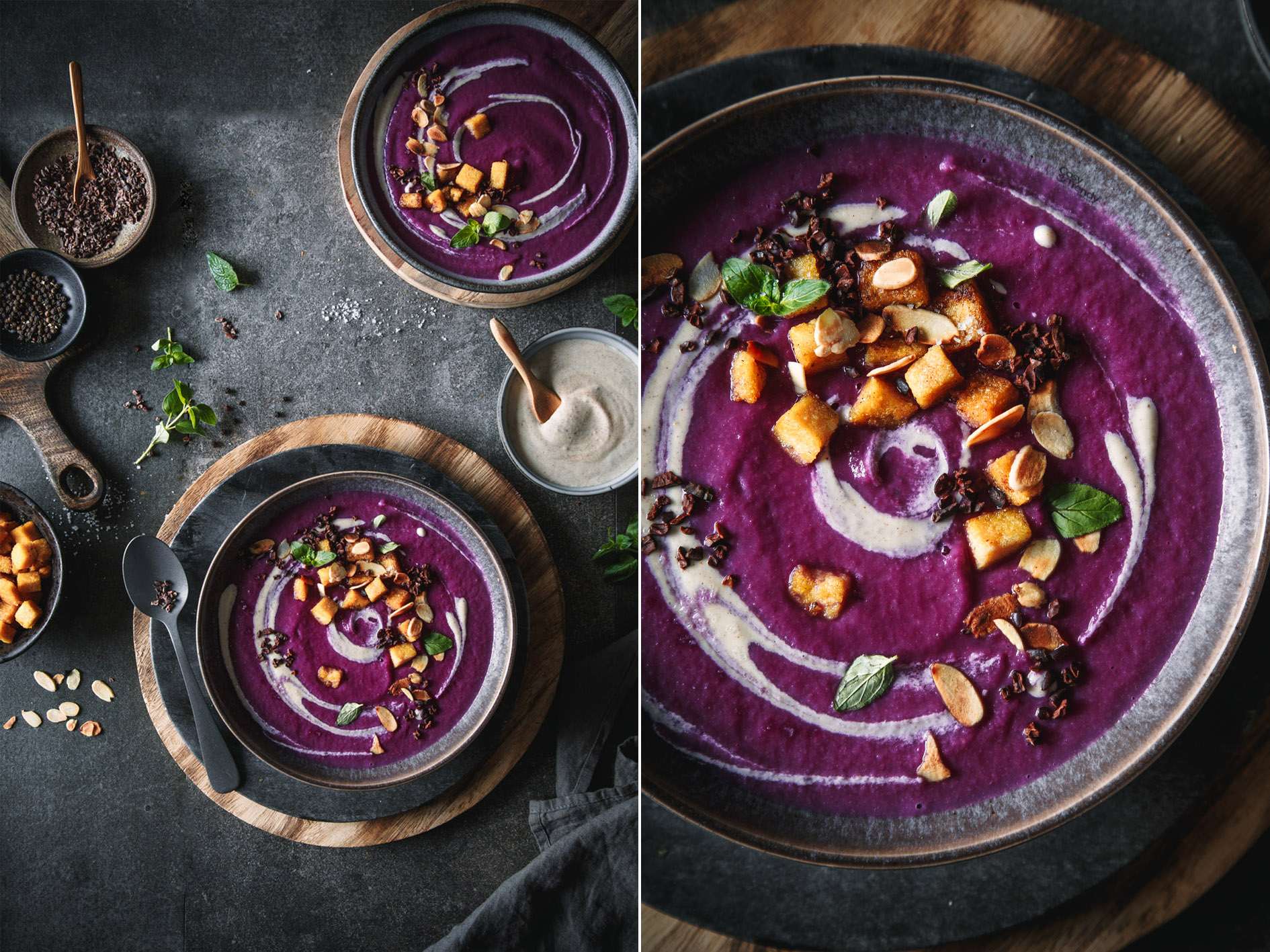 Ein großer Topf mit ominösem Inhalt wartet womöglich als Vorspeise, für alle Gemüse- und Suppenliebhaber. Eine besondere, violette Kreation erwartet einen jeden Gast : Eine cremige Süßkartoffel- Rotkohlsuppe mit gerösteten Weißbrotwürfeln .