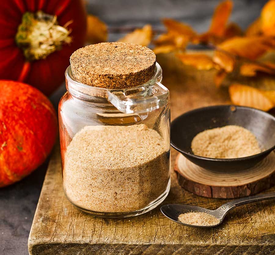 Die Gewürzmischung enthält Zimt, Muskatnuss, Nelken, Ingwer und Piment und eignet sich gut für Kürbisgebäcke wie Kekse und Kuchen aber auch als Bestandteil für aufgeschäumten Kaffee.(Pumpkin Spice Latte)