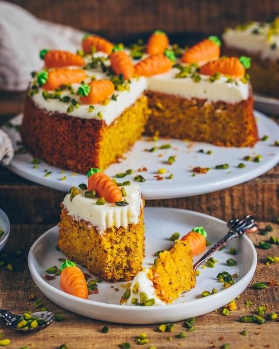 saftiger Karottenkuchen mit eingebackenen Haselnuss-, Pistazien- & Mandelsplittern. Verfeinert mit einer Vanille- Buttercreme.