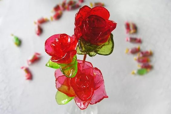 Rosen-Lutscher Bouquet ( ein kleines Sträußchen aus drei Bonbonrosen am Stiel. Neben dem kräftigen Waldmeistergeschmack in den grünen Blättern, dominiert in den Blüten fruchtige Kirsche )
