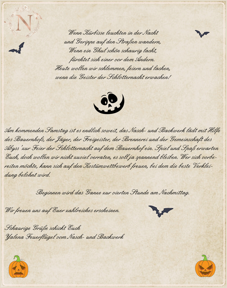Am kommenden Samstag ist es endlich soweit, das Nasch- und Backwerk lädt mit Hilfe des Bauernhofs, der Jäger, der Freigeister, der Brennerei und der Gemeinschaft des Abyss’ zur Feier der Schlotternacht auf dem Bauernhof ein. Spiel und Spaß erwarten Euch, doch wollen wir nicht zuviel verraten, es soll ja spannend bleiben. Wer sich vorbereiten möchte, kann sich auf den Kostümwettbewerb freuen, bei dem die beste Verkleidung belohnt wird.