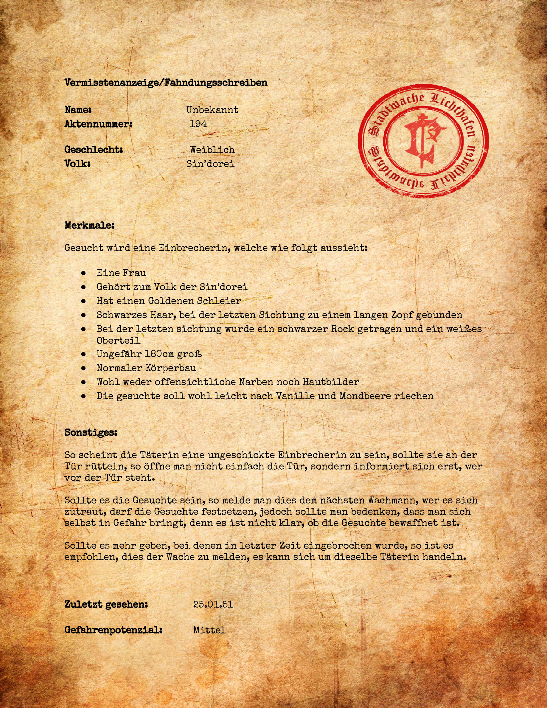 *ausgestellt und legitimiert durch die Stadtwache Lichthafen*