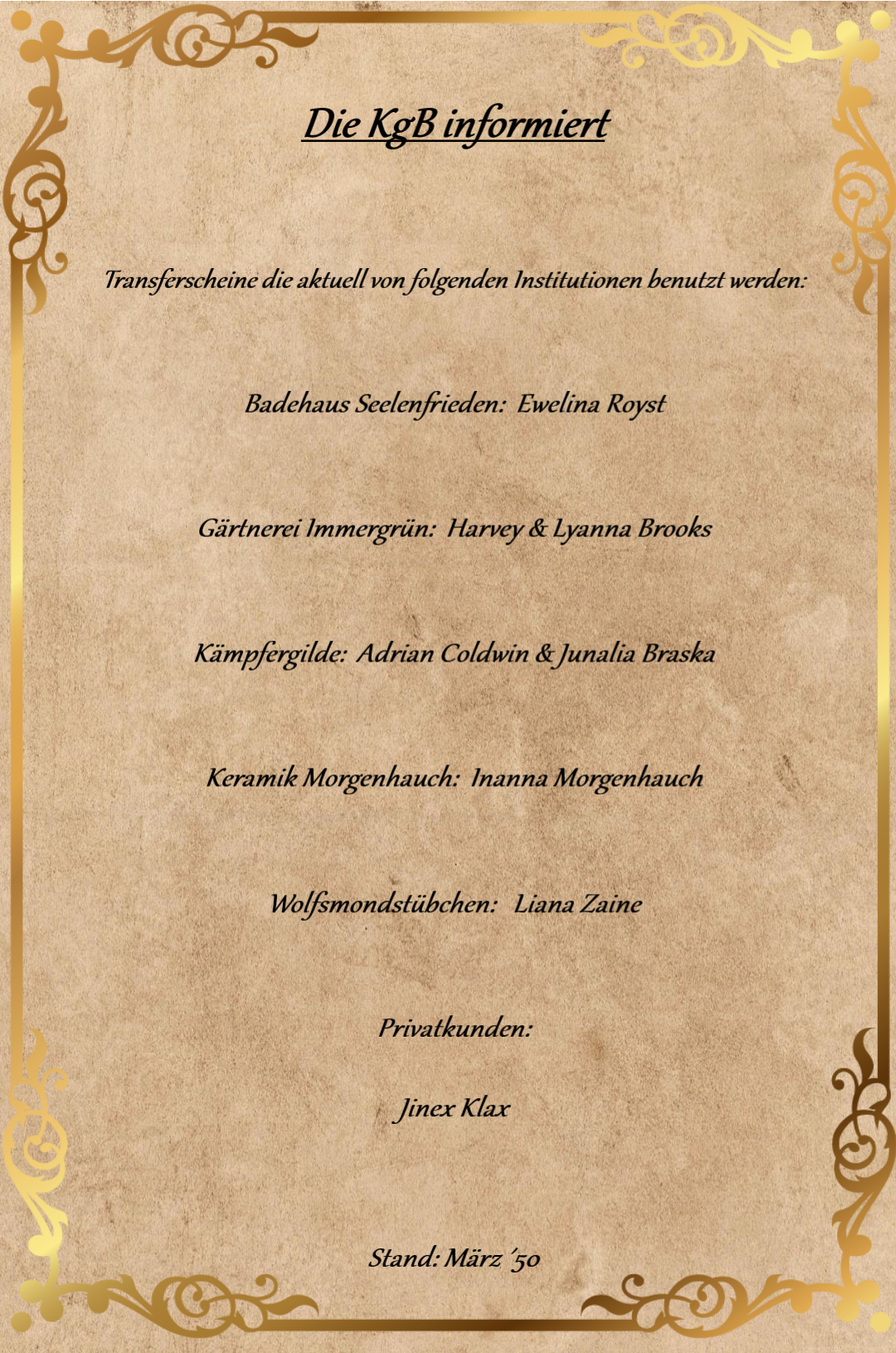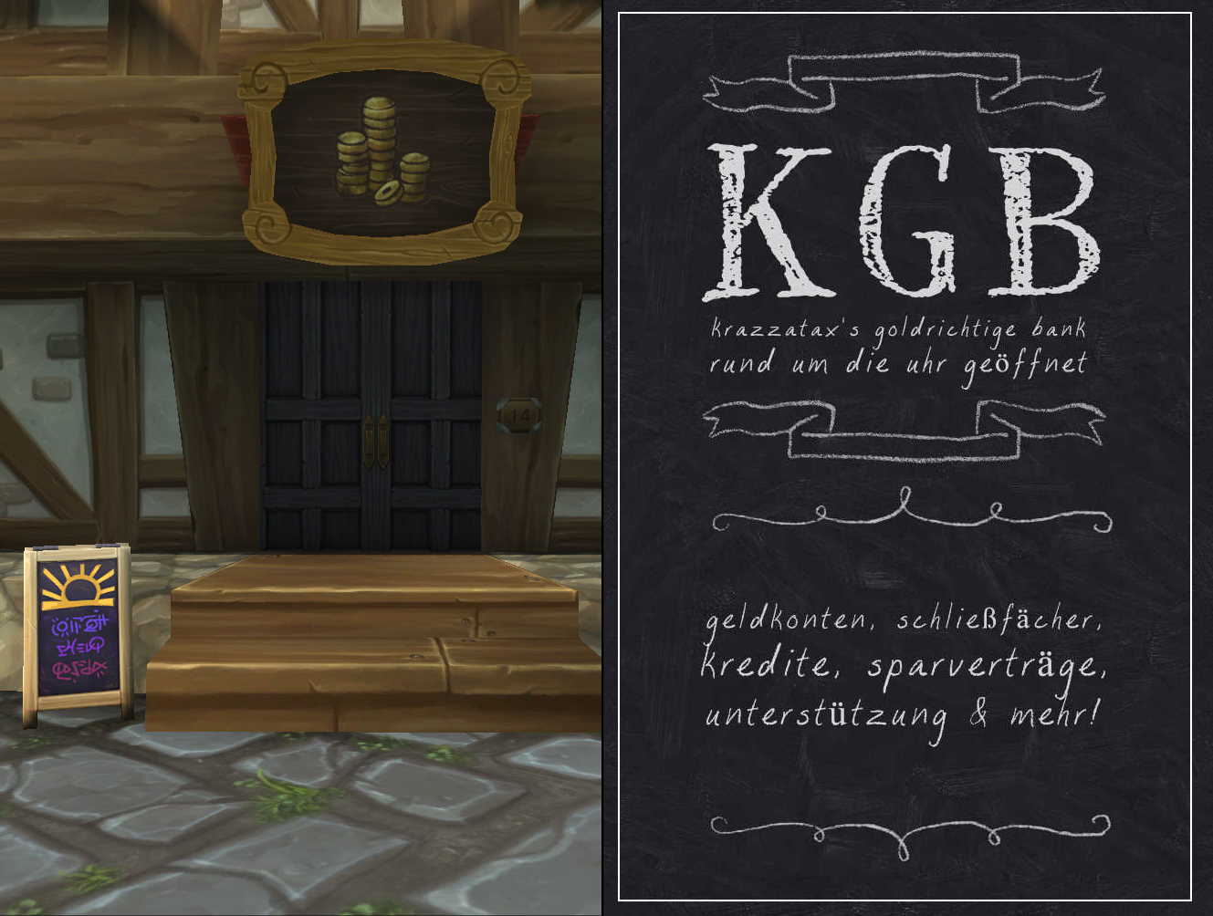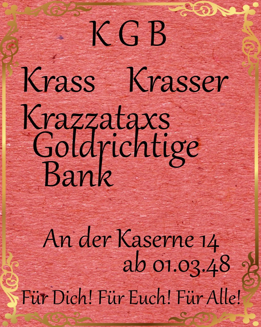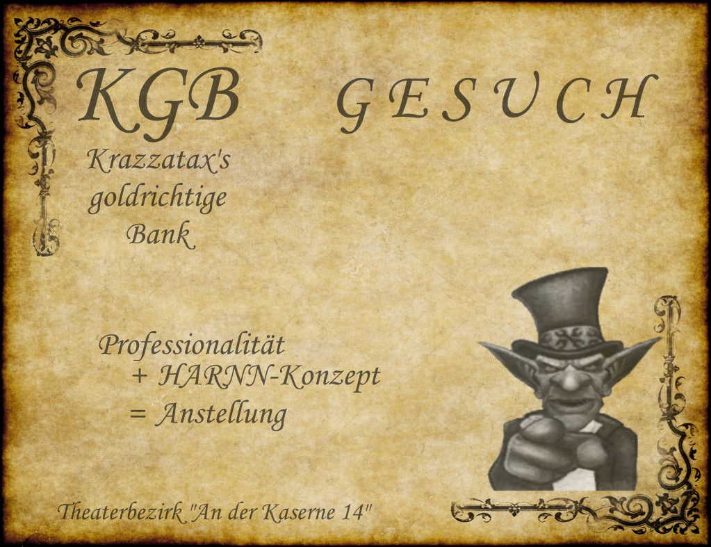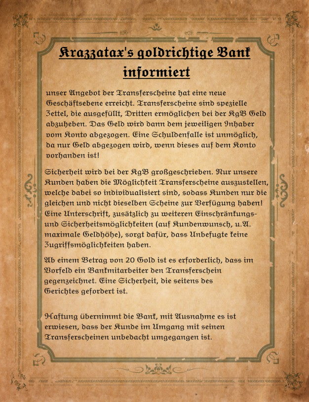Hier finden sich zukünftig alle Aushänge und Bekanntmachungen der Krazzatax's goldrichtigen Bank (KgB). Sie sind an den öffentlichen SchwarenBretter zu finden und werden auch in abgeänderter-Kurzform auf dem Kreideschild vor der Bank zu lesen sein.