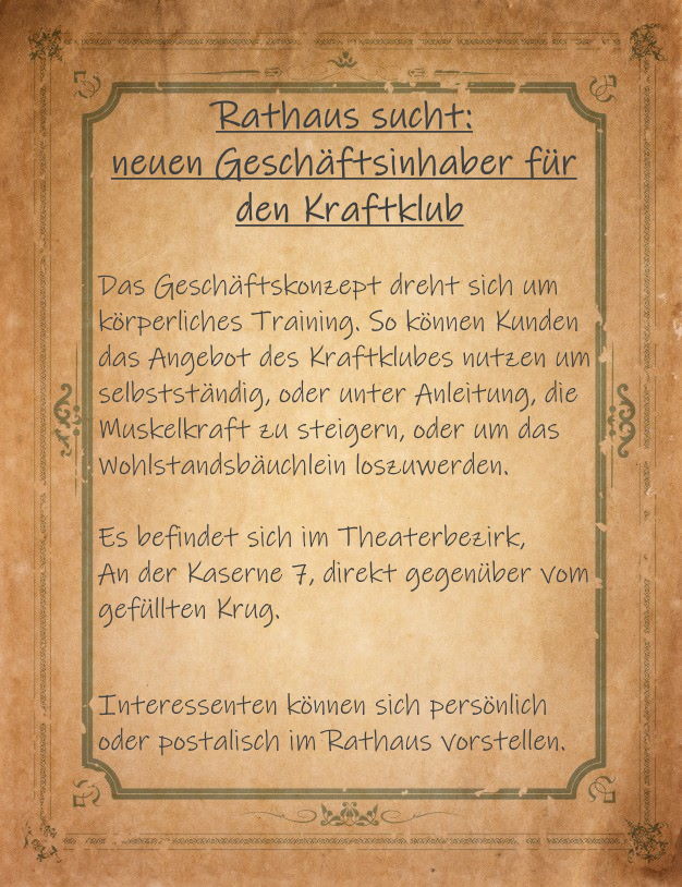 Das Geschaeftskonzept dreht sich um koerperliches Training. So koennen Kunden das Angebot des Kraftklubes nutzen um selbstaendig oder unter Anleitung, die Muskelkraft zu steigern, oder um das Wohlstandsbaeuchlein loszuwerden.